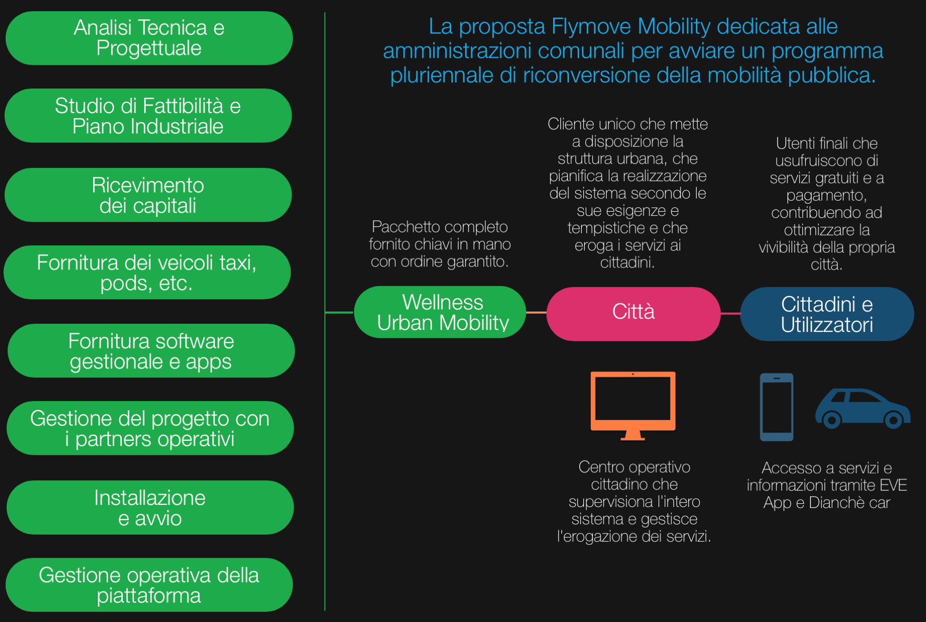 La piattaforma “Wellness Urban Mobility” di Flymove è un sistema completo, una filiera che parte dalla gestione dell'energia fino all'erogazione finale dei servizi agli utenti che utilizzano i servizi di mobilità integrata della città. Nasce grazie alla stretta collaborazione di numerose aziende italiane ed europee, sinergiche tra loro, che hanno messo a disposizione di Flymove la propria esperienza e tecnologia consentendo di realizzare la sua visione della mobilità del futuro.
