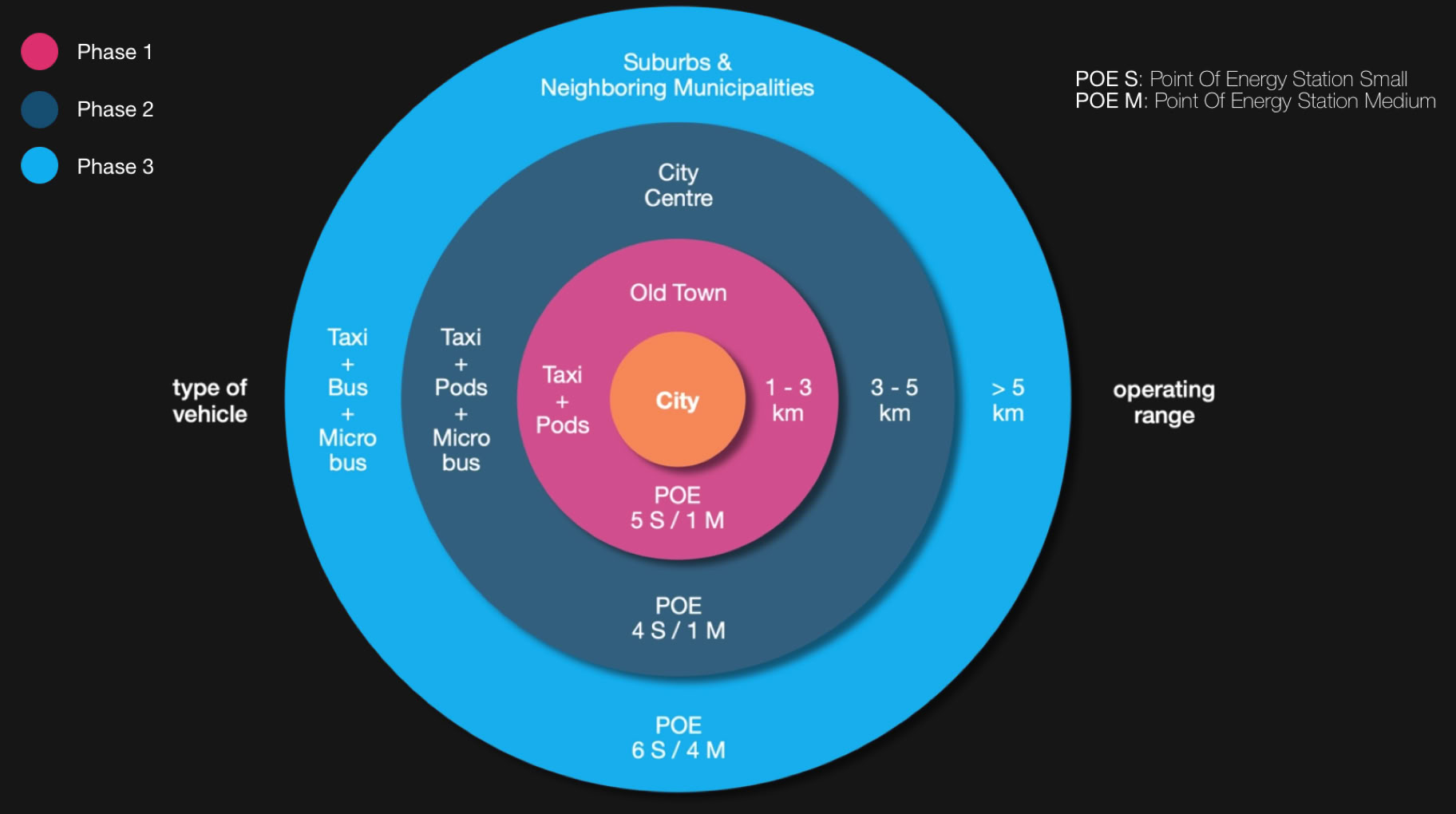 Il piano integrato della mobilità può essere attuato per fasi con la progressiva implementazione di mezzi, stazioni e servizi per specifiche aree cittadine. Nel caso mostrato, per una tipica città europea con ca. 100.000 cittadini.